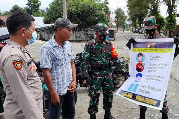 MANADO, Humas Polda Sulut – Personel Polsek Lolak dan Koramil melaksanakan operasi yustisi protokol kesehatan dalam rangka mencegah penyebaran Covid-19, Sabtu (20/02/2021) pagi, di Desa Lolak Tombolango, Kabupaten Bolaang Mongondow.