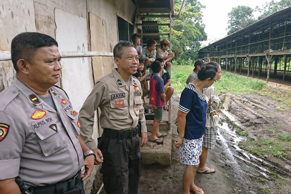 MANADO, Humas Polda Sulut – Kanit Binmas Polsek Matuari, AKP Salamun Sumariangen bersama Panit 1 Sabhara, Ipda Alfius Mai dan Bhabinkamtibmas Sagerat Weru Dua, Aipda Karno Jaya mendatangi peternakan ayam milik Steven, Sabtu (07/03/2020) pagi.