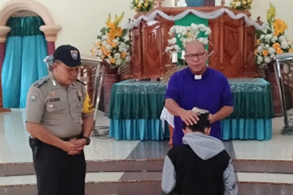 Usai menandatangani surat pernyataan tidak akan mengulangi lagi perbuatannya, Tran diantar oleh anggota piket Polsek Amurang ke Gereja GMIM Baitel Kelurahan Ranoiapo untuk didoakan oleh Pendeta, pada Minggu siang (06/10/2019).