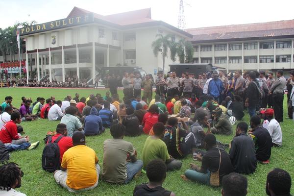 Ratusan mahasiswa Papua itu pun bergerak ke Mapolda mendesak pihak kepolisian melepaskan rekan mereka yang ditahan. Setelah sampai di depan kantor Polda Sulut, ratusan mahasiswa Papua ini, diizinkan masuk kedalam halaman Mapolda. Kabid Propam Polda Sulut AKBP Eko Widianto, memerintahkan kepada personel untuk melakukan pemeriksaan kepada setiap mahasiswa dan menyita semua atribut, yang digunakan.