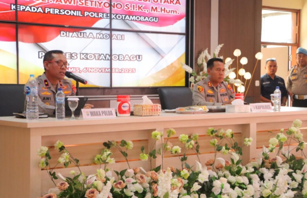KOTAMOBAGU, Humas Polda Sulut – Wakapolda Sulawesi Utara Brigjen Pol Awi Setiyono memberikan arahan kepada seluruh personel Polres Kotamobagu di Aula Motabi, Kamis (06/11/2025).