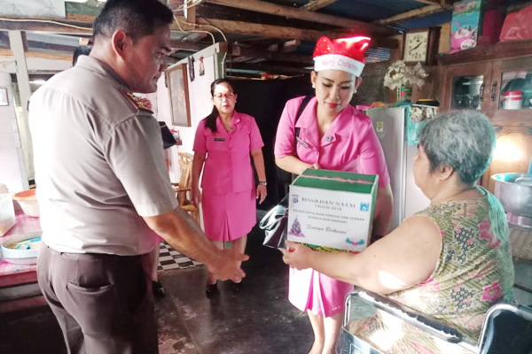 Kapolres Sangihe AKBP Sudung Ferdinand Napitu, SIK bersama Ketua Bhayangkari Cabang Sangihe Ny. Rosdiana S. F. Napitu dan para pejabat utama lingkup Polres melaksanakan bakti sosial dengan berbagi kasih menyerahkan bingkisan Natal terhadap masyarakat yang membutuhkan, Selasa (11/12/2018).