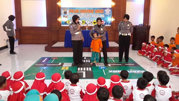 Tribratanewsjateng – Kesatuan Lalu Lintas Kepolisian Resor Magelang kembali memberikan sosialisasi pengenalan rambu-rambu lalu lintas kepada TK dan Kelompok Bermain islam fahma Salaman di Aula Mako 2 Jagoan Magelang. Acara tersebut diikuti kurang lebih 142 orang terdiri dari siswa TK 60, siswa Paud 62 dan guru pendamping 11. Kamis (21/01).