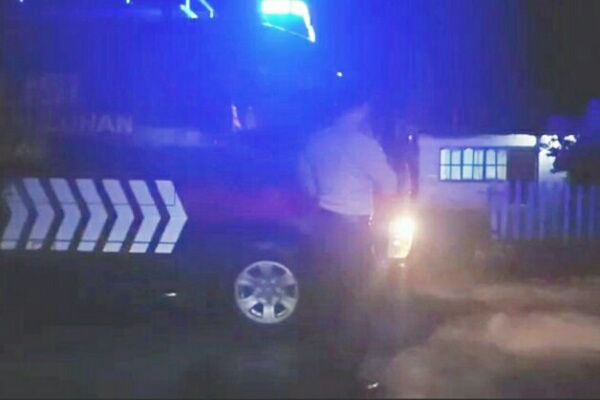 Dengan menggunakan pengeras suara, personil Satbinmas mengimbau warga untuk mengikuti ibadah di Gereja
