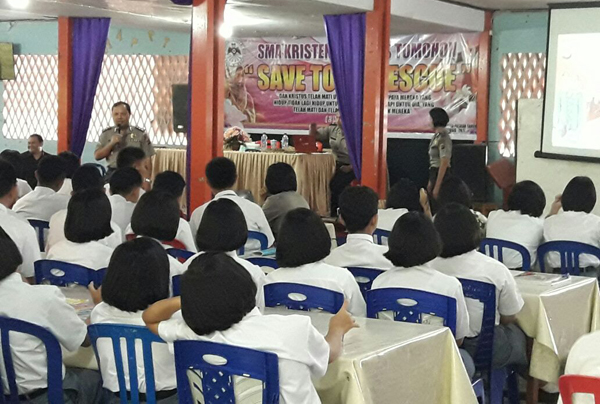 MANADO, Humas Polda Sulut – Setelah menggelar sosialisasi penerimaan Polri terpadu 2017 di SMU Lokon Tomohon, Selasa (04/04), Direktorat Binmas Polda Sulut kembali mengadakan kegiatan serupa di SMA Kristen 2 Binsus Tomohon, Rabu (05/04) pagi. Sosialisasi dipimpin oleh Kasubdit Bintibmas Direktorat Binmas Polda Sulut, AKBP Bambang Dwi Jatmiko didampingi Kanit Binkamsa Satuan Binmas Polres Tomohon, Bripka A. Umboh.