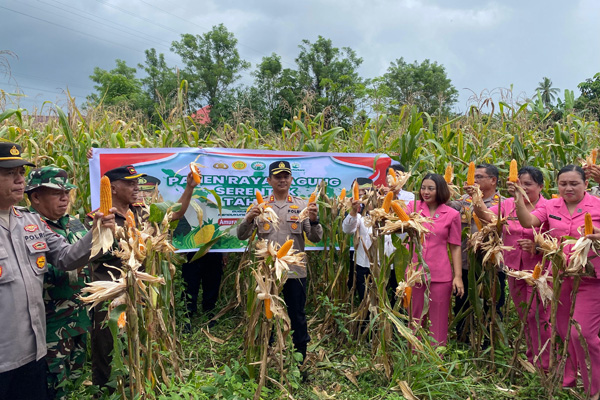 Kapolres Minahasa Selatan (Minsel) AKBP David Candra Babega didampingi Ketua Bhayangkari Cabang Minsel Ny. Qori David Candra, memimpin panen raya jagung, di perkebunan Desa Lopana, Kecamatan Amurang Timur, Rabu (26/2/2025) pagi.