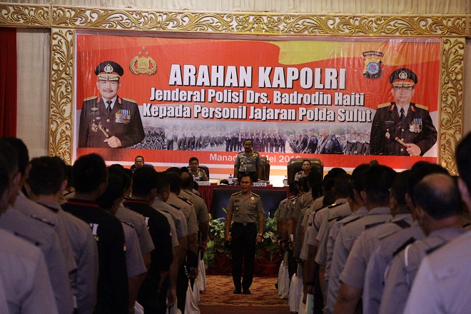 Pernyataan tersebut dilontarkan Kepala Kepolisian Republik Indonesia Jenderal Polisi Drs. Badrodin Haiti saat memberikan arahan kepada 3400 personil jajaran Polda Sulut, baik Perwira, Bintara, Tamtama dan PNS Polri yang hadir di Manado Convention Centre (MCC), Jumat (20/5/2016).