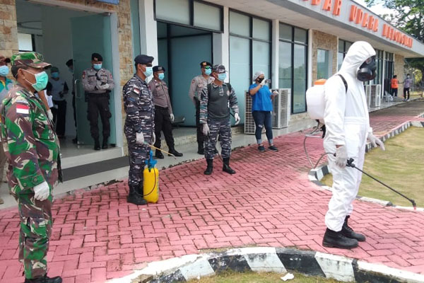 MANADO, Humas Polda Sulut – Tim Gabungan terdiri dari Satgas Aman Nusa-II Polres Kepulauan Talaud bersama TNI dan Pemkab Kepulauan Talaud melakukan upaya pencegahan penyebaran Covid-19 di Bandara Melonguane, Minggu (19/04/2020) pagi.